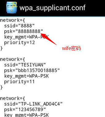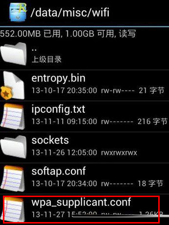 2、打开R.E文件管理器,进入data/misc/wifi,目录里有个wpa_supplicant.conf或者其他文件名以.conf结尾的文件,所有手机记住的wifi密码都在这个文件里。