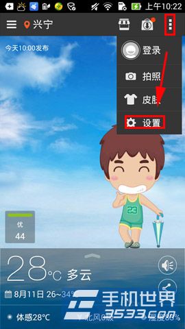 1)安装并打开墨迹天气,点击主界面的【三横】,选择【设置】。(如下图)
