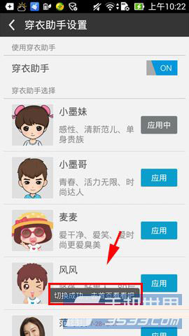2)在“设置”面板中选择【穿衣助手设置】,根据所需选择喜欢的形象点击【应用】即可。(如下图)
