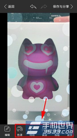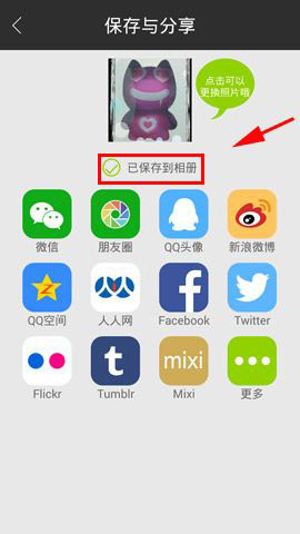 3)在【装饰】选项中,我们还可以添加【文字】【底纹】【马赛克】【饰物】。调整完毕后点击【保存与分享】即可(如下图)