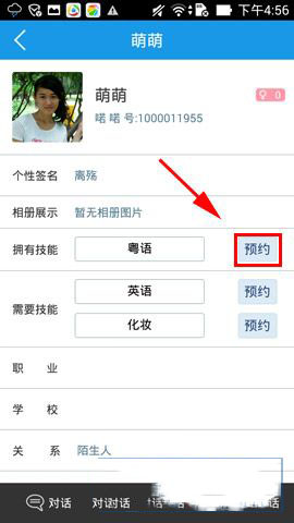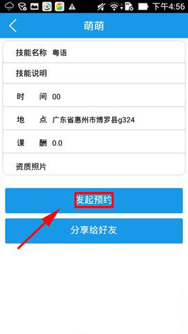 2)点击需要预约的技能【预约】,点击【发起预约】。