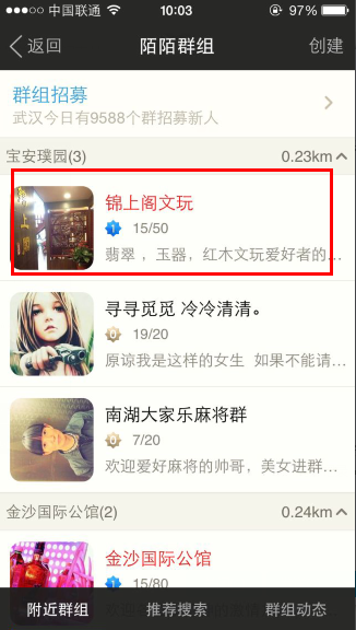 2、点击陌陌群组后,将会出现许多陌陌群,并显示出它与你相隔的距离,你可以根据它的介绍而选择加入,如图。