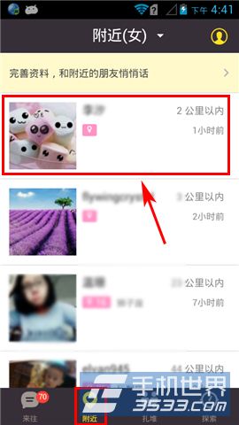 1)打开来往,点击下方的【附近】栏,选择要分享实时头像的用户,点击下方【悄悄话】。(如下图)