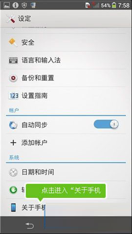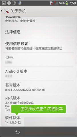 1)找到并打开索尼C3 S55T的手机【设定】,点击【关于手机】,连续点击【内核版本】。(如下图)
