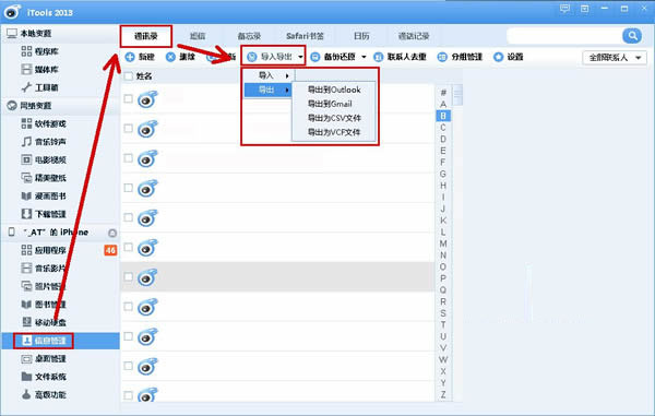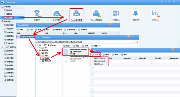 连接iPhone,进入iTools选择【工具栏-iTunes备份管理】,鼠标双击打开需要恢复【通讯录】的备份,点击联系人,鼠标双击打开第一个文件(即‘AddressBook’),点击导出选择导出的文件类型,输出文件名,保存