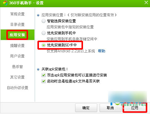 接着点击 =》【应用安装】=》勾选【优先安装到SD卡中】=》再点击【应用/确定】即可。