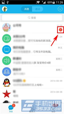 1)打开手机QQ,然后找到那个未读消息的提醒小圆点。(如下图)