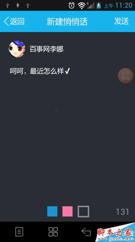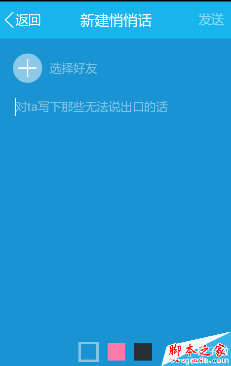 2,点击QQ悄悄话,进入QQ悄悄话编辑界面,点击下面一个像钢笔的图标,编辑我们想对某一个好友想说的话,小编发现编辑界面有3个编辑背景可供选择。