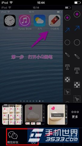 7)我们在进行标注时如遇到操作错误,还可以点击屏幕中间的【返回上一步】【返回下一步】进行调试;最后别忘了把制作好的图片发给朋友进行讨论哦点击【打开】按钮后选择【QQ】或者【微信】。(如下图)