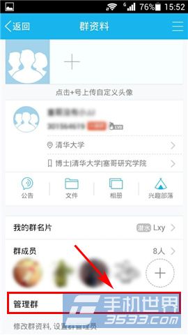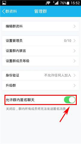 3)在该页面找到并点击进入【管理群】,把【允许群内匿名聊天】选项打开即可。(如下图)
