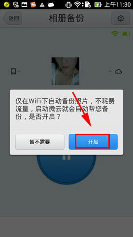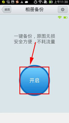 2)点击【开启】,接着可根据需求选择是否开启自动备份,小编选择了【开启】这样相册有更新了就自动备份相当方便。(如下图)