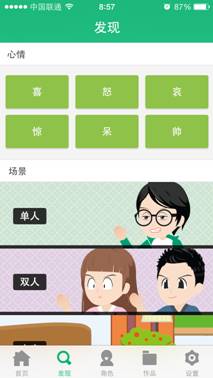 另外,值得一提的是应用为用户提供了相当丰富的场景选择,在完成角色的创建后,系统提供了单人、双人和家庭等多项场景选择。用户可以根据自己的心情和喜欢赋予角色生命!令人惊喜的是在场景下用户可以赋予角色喜怒哀乐各种神态表情,可以非常贴切的表现自身的心情。