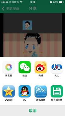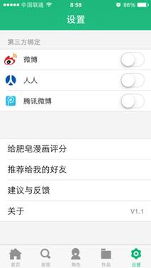 正所谓独乐乐不如众乐乐,如此有趣的漫画自然要和朋友一起分享才能让众好友羡慕不已,这也是我们的目的所在!用户在完成漫画的创作后可在首页进行一键分享,应用提供的微博、微信、QQ、人人等主流的社交平台,基本可以满足大家的社交需求。用户也可在设置中和社交平台进行绑定。