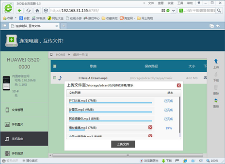 2、上传文件到手机中,点击右上角的上传按钮,在电脑中查找需要上传的文件,点击上传,现已音乐为例: