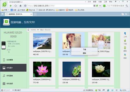 闪传只需要在电脑浏览器中,就可以对文件进行移动、删除、上传、下载、重命名等操作,还可以新建文件夹,这样管理手机文件既方便又实用,不仅罗列出手机内存及SD卡上的所有文件;而且还对手机中的图片、音乐、视频进行分类整理;