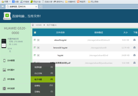 闪传还把手机中的文件进行了分类如办公文档、电子书籍、安装包、压缩文件、大文件等,在文件管理中查找不到时,也可在文件分类中找到,通过浏览器管理手机文件这种思考设计非常的人性化。