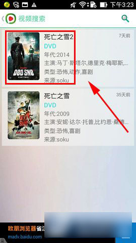 2)根据需求选择自己想要的分类如【动作片】,在动作片界面轻触屏幕并向下滑动即可查找影片。(如下图)