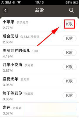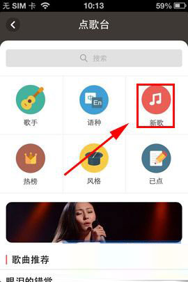 2)在点歌台中我们可以根据自己的需求选择类别,小编这里以【新歌】为例,进入后点击自己喜欢的歌【K歌】即可。(如下图)