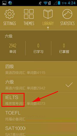1)安装并打开不背单词。轻触主界面并下拉,点击【LIBRARY】。(如下图)