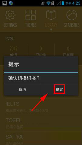 2)根据需求选择词书如【IELTS】点击该词书,等待其下载完毕后可见提示点击【确定】切换即可。(如下图)
