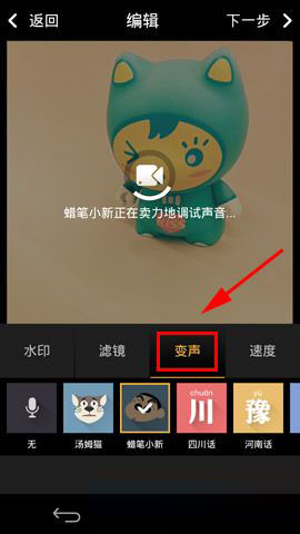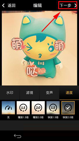 1)安装并打开秒拍,当我们录制完视频后便进入视频短片【编辑】状态,点击【小箭头】进行自定义编辑。(如下图)