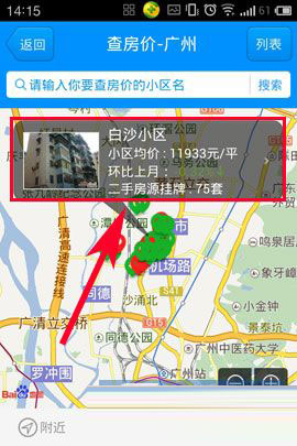 2)清晰明了的可以查看到周边所有的房价,然后选择所看中的点击即可看到详情。(如下图)