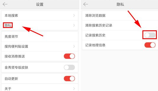 2、在设置界面中点击【隐私】,最后将【记录搜索历史】调整成失效状态即可。