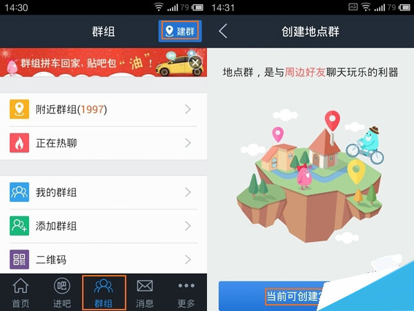 打开手机百度贴吧,在底部菜单栏中选择“群组”,然后点击右上角的“建群”。进入“建群”后就能创建地点群了。默认只能建立3个群。