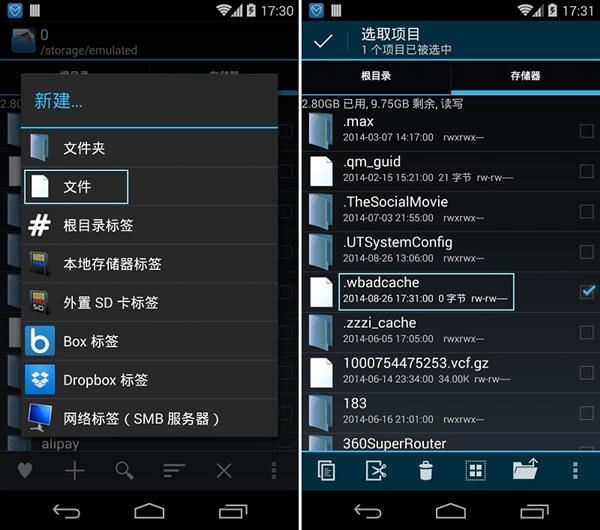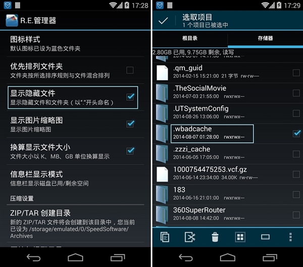 由于“.wbadcache”文件夹是个隐藏文件夹(名称前带“.”的均为隐藏文件),所以要在R.E.管理器的设置中,勾选上“显示隐藏文件”。
