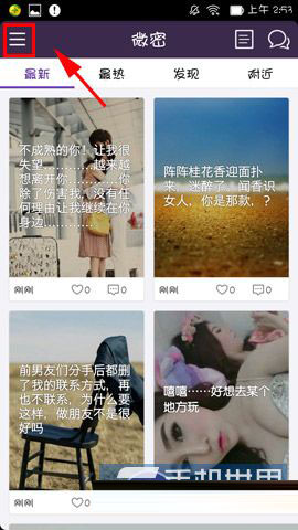 1)安装并打开微密,点击主界面左上方的【三横】。(如下图)