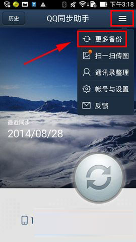 1)安装并打开QQ同步助手,点击主界面中的【三横】选择【更多备份】。(如下图)
