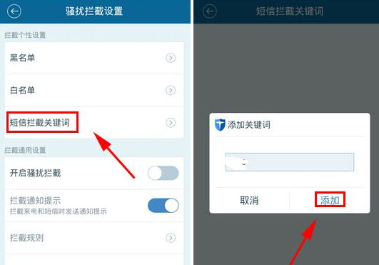 3、点击【短信拦截关键词】,点击【添加关键词】输入想要拦截的关键词点击【添加】即可。