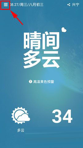1)安装并打开懒人天气,点击主界面中的【三横】。(如下图)