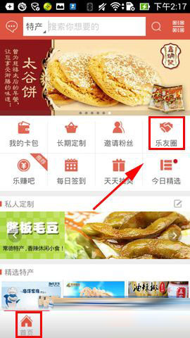1)安装并打开微乐,点击主界面中的【首页】打开【乐友圈】。(如下图)