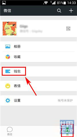 1)打开微信,选择【我】栏,点击【钱包】。(如下图)