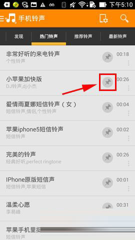 1)安装并打开好铃声,根据需要找到自己喜欢的铃声,点击【图钉】播放按钮。(如下图)