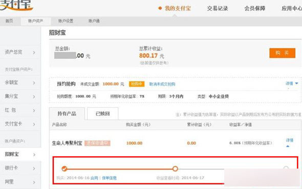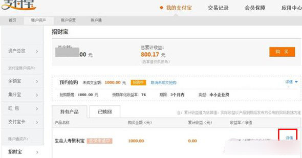 第一步、我们在网页上登录支付宝账户,找到“账户资产”的“招财宝”,查看到你的保险产品后,点击“详情”。
