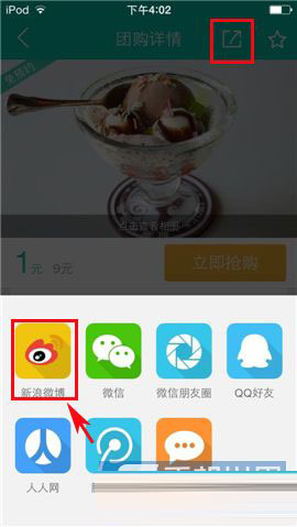 1)打开美团,点击你喜欢的商品进入,点击右上方【正方形图像】,弹出窗口点击【新浪微博】。(如下图)