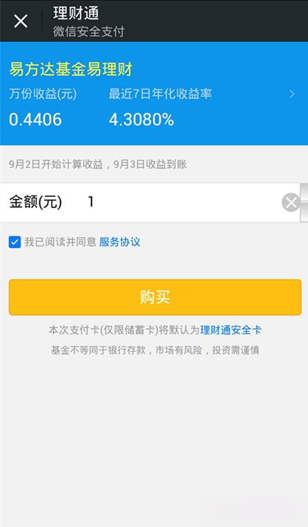 第五步、“微信”界面上就会出现购买理财通的界面,理财通实际上就是华夏基金财富宝。你进行输入金额,小编钱少事多就输入1元,讨个喜头。并勾选“同意”,点击“购买”。