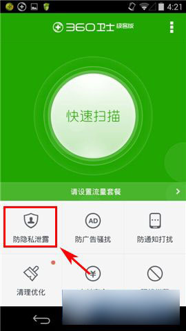 1)打开360卫士极客版,点击【防隐私泄露】,选择【软件隐私权限管理】。(如下图)