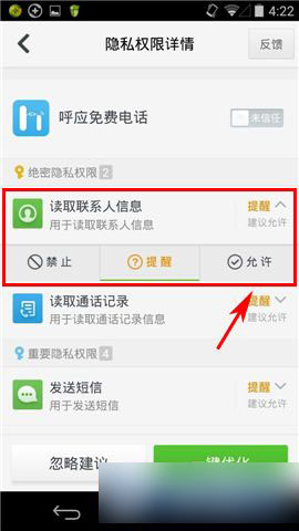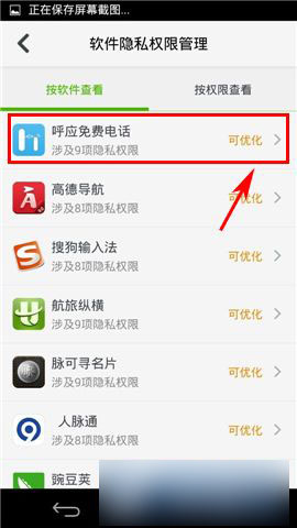 3)回到【软件隐私权限管理】,点击【按权限查看】栏,可以按权限查看,在里面,也同样可以禁止或允许某一软件的该全权限。(如下图)