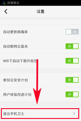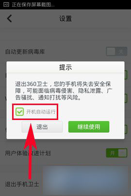 2)点击【设置】,在设置界面拉倒最后点击【退出手机卫阿士】然后勾掉【开机自动运行】(如下图所示)