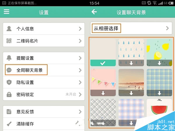 打开“易信”软件,在侧边栏中选择“设置”。进入“设置”界面后,点击“全局聊天背景”。进入易信的聊天背景设置界面后,用户可以选择易信提供的背景,也可以点击“从相册选择”中选择手机上好看的图片作为背景。