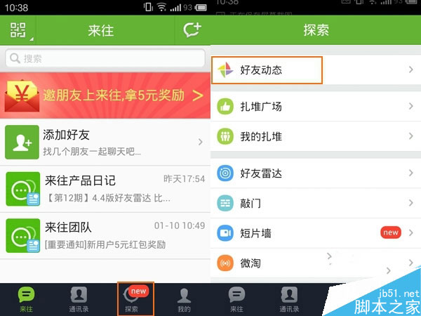 首先,下载或更新来往客户端到4.4版本,点击底部菜单栏中的“搜索”。进入“搜索”后,点击“好友动态”。