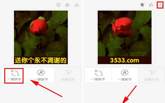 3、进入图片详情后点击【一键换字】;输入文字后系统便会自动换字。修改完毕可以选择【下载】或者是发到QQ微信上等。