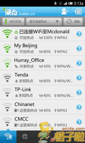 利用wifi万能钥匙,可实现附近热点的查找,并能自动分析出周围可破解的wifi热点。附近所有的热点wifi都会通过以形象的地图标记的形式进行展示,非常方便利用自己寻找到距离自己最近、信号最强的wifi热点。