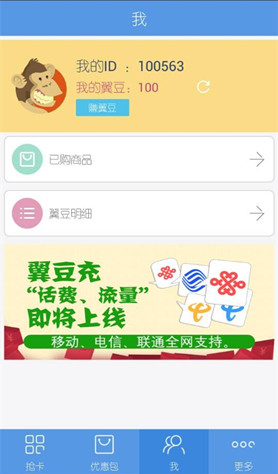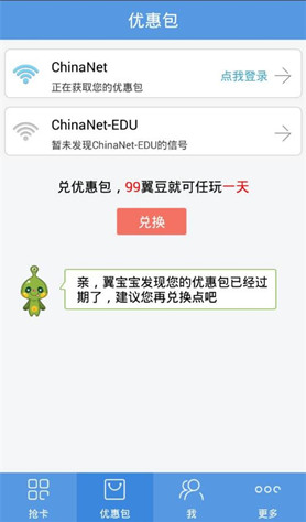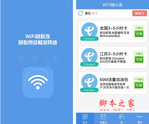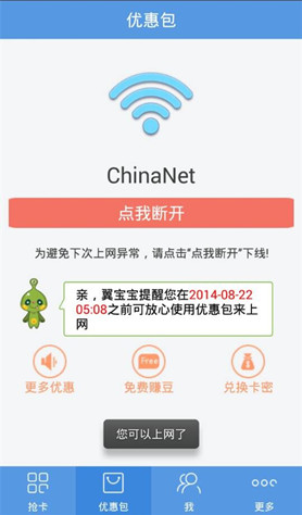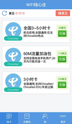 1、用户首次安装“WiFi随心连”,将获得官方赠送的100翼豆(39翼豆可兑换1张chinanet时长卡)