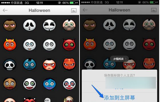 二、接下来我们点击选择一个自己喜欢图标,然后会弹出操作选项,此时我们点击“添加到主屏幕”如下示意图所示:
