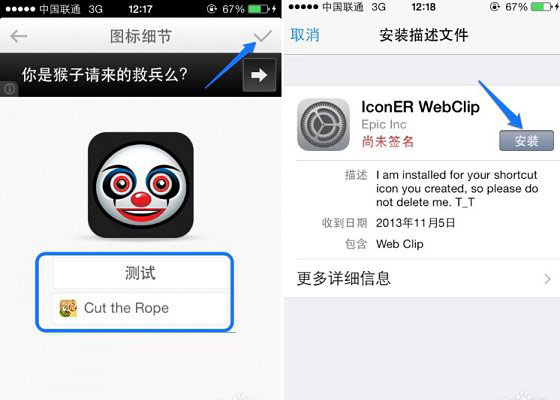 四、添加完图标名称和应用链接之后,我们点击右上角的√,接下来会提示我们需要安装一个名为IconER WebClip应用,我们点击安装,如下示意图所示: