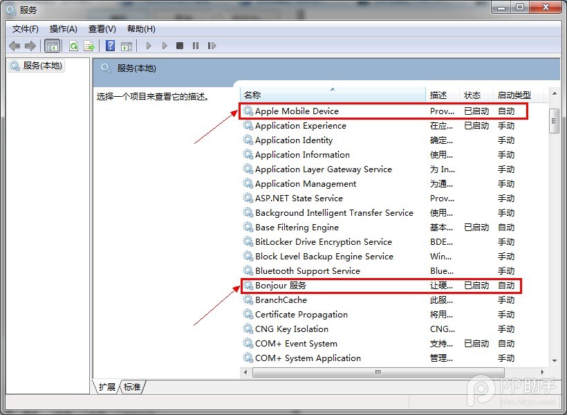 首先--运行--输入:services.msc --找到APPle mobile device 和Bonjour 这两个,点击右键看是否启动,点击启动。在点击右键--选择属性--启动类型为“自动” 然后重启电脑,在打开PP助手试试。